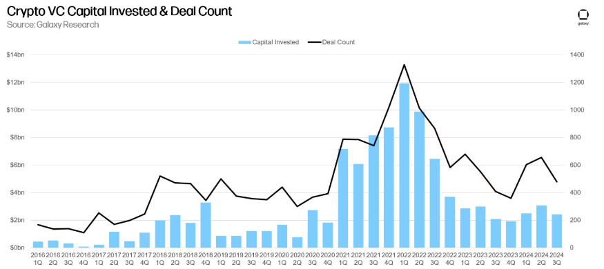 2024年第三季度,加密初创企业的风险投资总额为24亿美元(环比下降20%),涉及478笔交易(环比下降17%)。