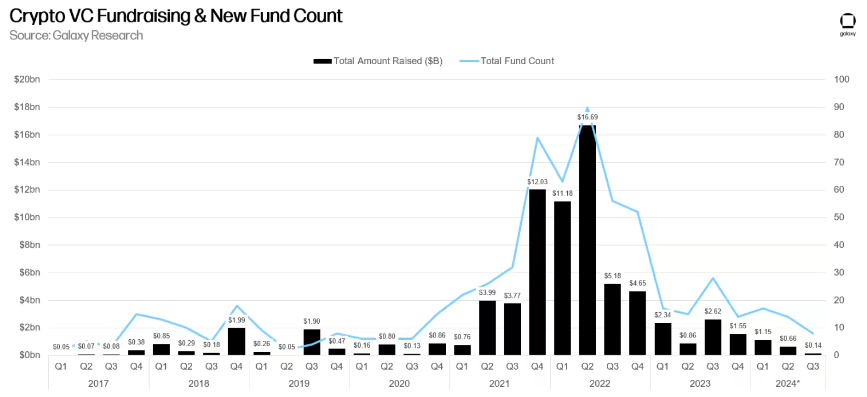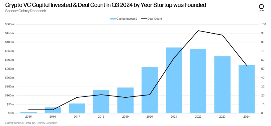 加密风险基金的融资仍然充满挑战。2022 年和 2023 年的宏观环境和加密市场的动荡,使一些配置者不愿对加密风险投资者做出与 2021 年和 2022 年初相同水平的承诺。2024 年初,投资者普遍认为利率将在 2024 年大幅下降,尽管降息直到下半年才开始实现。自 2023 年第三季度以来,分配给风险基金的总资本继续环比下降,2024 年第三季度筹集的新基金数量是自 2020 年第三季度以来的最低水平。