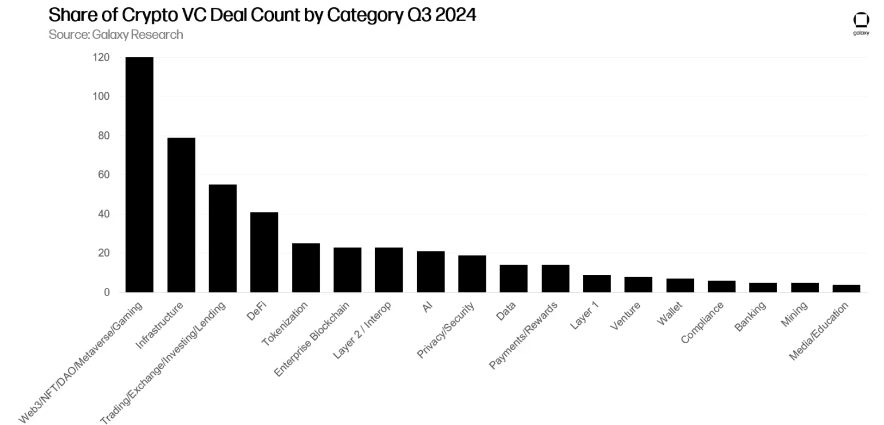 从交易数量来看,Web3/NFT/DAO/元宇宙/游戏类别以25%的交易量(120笔)领先,环比增长30%,其中有48笔交易来自游戏项目。2024年第三季度最大的一笔游戏交易是Firefly Blockchain在其B轮融资中筹集了5000万美元。