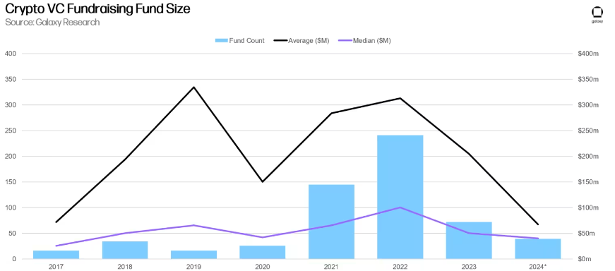 配置者兴趣的下降导致新的加密风险投资基金减少,筹集的基金规模也较小,2024 年(截至第三季度)的中位数和平均基金规模达到 2017 年以来的最低水平。