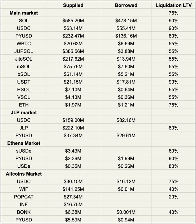 大部分流动性集中在主市场。然而,JLP市场最近获得了显著的增长,新增了PYUSD,这使得JLP的低成本循环成为可能,因为PayPal向PYUSD的借款人支付了激励。