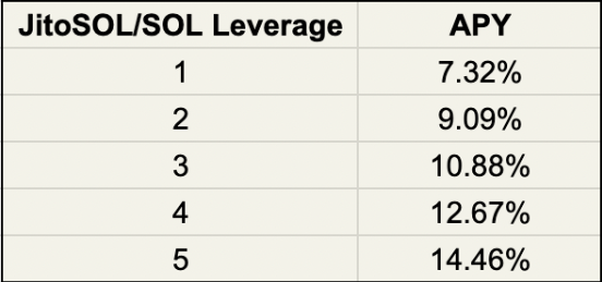 Kamino的另一个核心产品是自动循环借贷头寸,最高可达5倍杠杆。这一功能的例子包括JitoSOL/SOL,通过使用闪电贷款以抵押的资产(如JitoSOL)借入SOL,从而实现对基础代币收益的杠杆敞口。对于JitoSol,实际收益可以在下面的表格中查看。