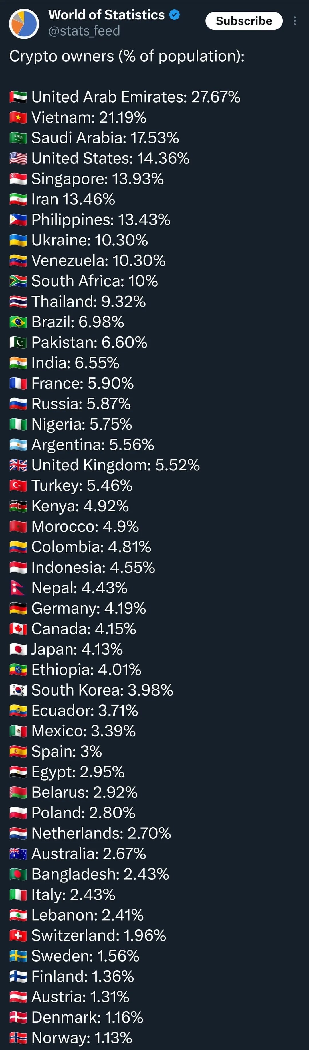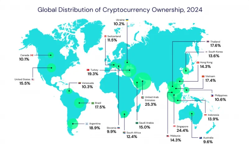 - 全球加密货币持有者估计数:截至 2024 年,估计全球加密货币持有者约有 6.17 亿。这一数字约占全球互联网用户总数(约 50 亿人)的 12%。