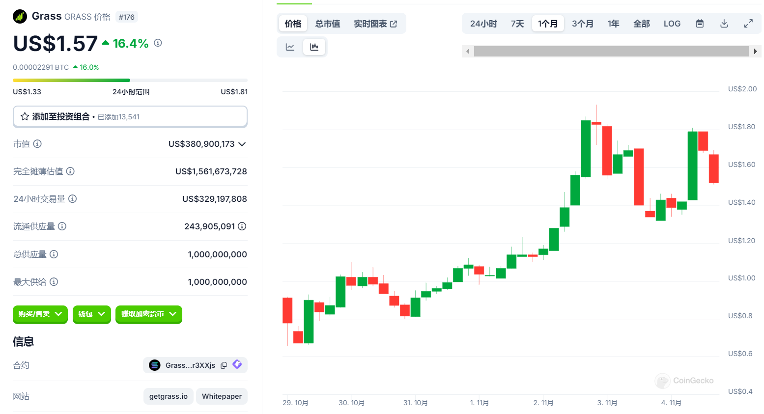 在加密市场近期震荡中,Grass代币($GRASS)以其独特的表现引发了市场的广泛关注。尤其是在过去五天里,比特币价格从73,000美元下滑至最低67,400美元的背景下,许多山寨币遭遇了同样的命运,纷纷下跌。然而,Grass却逆势上涨,从最低0.65美元一路攀升至最高1.86美元,目前的稳定价格为1.56美元,流通市值达到3.8亿美元,FDV(完全稀释估值)为15.5亿美元,超越了Depin项目IO.NET的12亿美元市值。这一逆市拉盘的表现让Grass在动荡的加密市场中,显得尤为突出,也为众多投资者带来了新的希望。