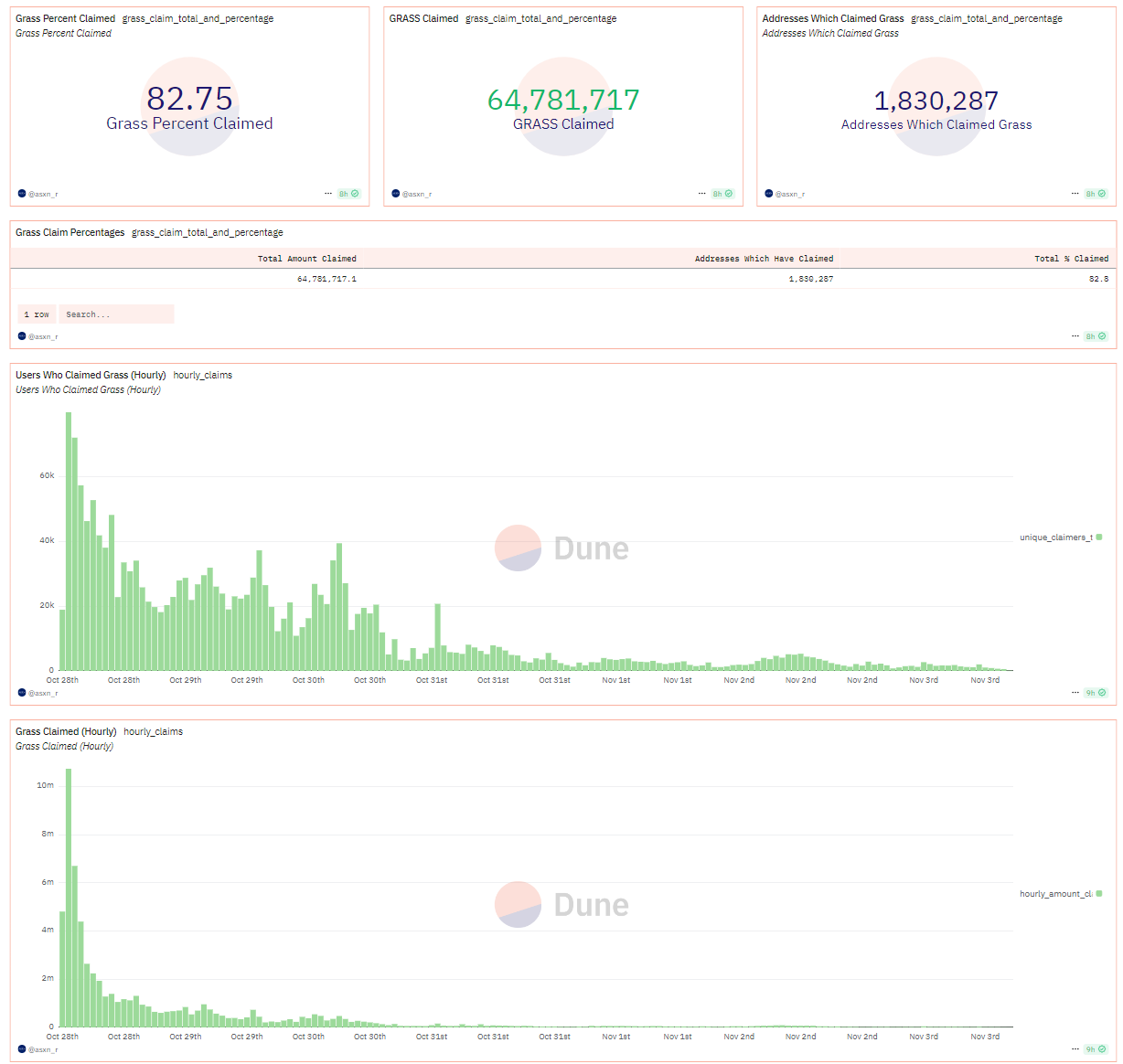 此外,空投的申领情况也值得关注。至今已有1,830,287个地址成功申领了约64,781,717枚$GRASS,占Claim总量的82.75%。平均每个地址申领数量约为35.4枚。这种持币地址的广泛分布有助于降低大鲸鱼地址对价格的影响,从而增强市场的稳定性。