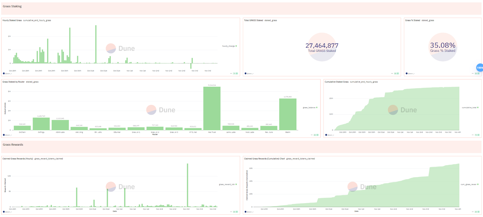 根据Dune的数据,目前Grass的总质押量为27,464,877 GRASS,占总供应量的35%。这一质押需求超出了笔者的预期,反映出市场对Grass生态系统的信心。此外,当前的年化收益率(APR)为43.69%,这一高收益率无疑吸引了大量投资者的关注。值得注意的是,随着质押量的增加,APR很可能会逐渐下降,这在DeFi领域是一个普遍现象。