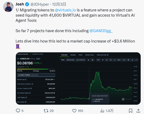 - $VIRTUAL 升值带来的财富效应流入新代理,而成功的代理可以通过交易收入获得$VIRTUAL,这些收入可以再投资。