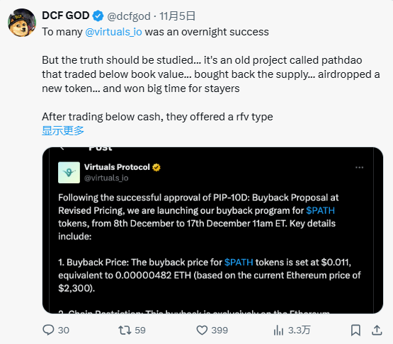 - 并且在2023年12月,通过回购计划清除了剩余的弱手,以取代从PathDAO到Virtuals Protocol的品牌重塑。