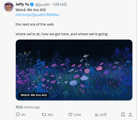 @jyu_eth(@0xzerebro 的创作者)更进一步,宣称我们已经迈入了 Web4 时代。