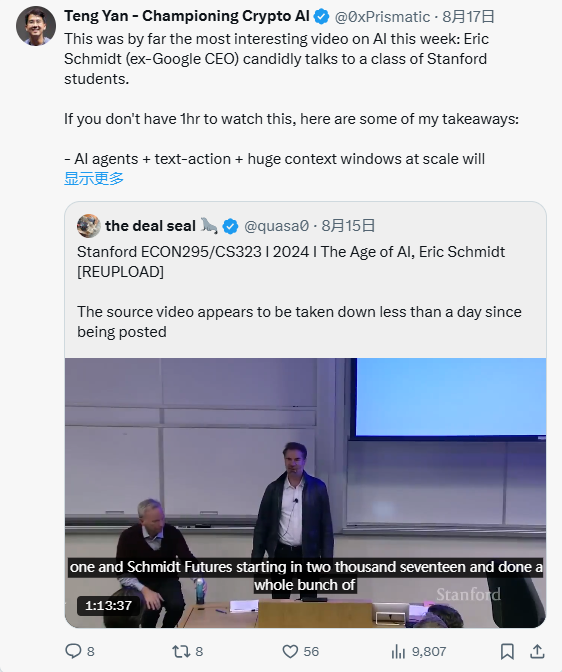 前谷歌CEO埃里克·施密特(Eric Schmidt)在被问及2025年人工智能的最重要趋势时,提出了三个关键词:无限上下文窗口、文本到行动以及AI代理。