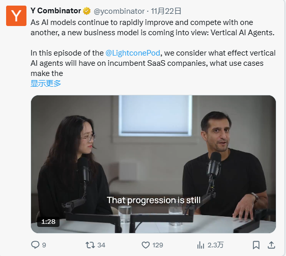 Y Combinator 的合伙人专门录制了一期播客,论证“垂直领域AI代理的潜力可能是SaaS的10倍”,并预测顶尖的AI代理公司市值将达到 3000亿美元。