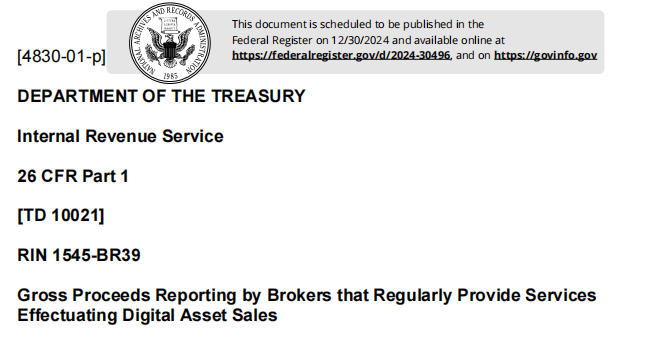 美国财政部与国税局近日发布了一项重要新规(RIN 1545-BR39),扩展了现有税收法律的适用范围,将DeFi的前端服务提供商纳入“经纪商”的定义。这些服务提供商,包括任何直接与用户交互的平台(如Uniswap的前端接口),被要求从2026年开始收集用户的交易数据,并在2027年起通过1099表格向美国国税局(IRS)提交信息,内容包括用户的总收益、交易细节及纳税人身份信息。