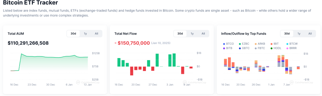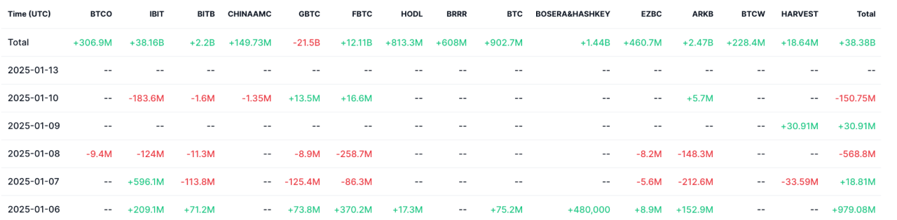 上周交易日(1 月 6 日至 1 月 10 日)比特币现货 ETF 上周单周净流入 3.07 亿美元。上周单周净流入最多的比特币现货 ETF 为贝莱德(Blackrock)比特币 ETF IBIT ,周度净流入为 4.98 亿美元。