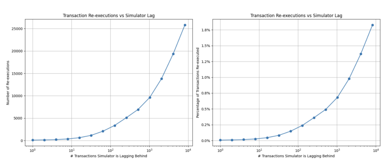 图 2:需要重新执行的事务数量与执行器滞后于事务数量的关系。