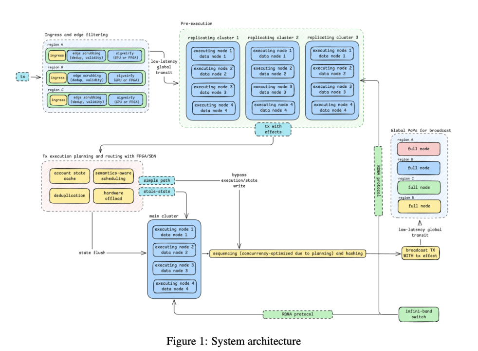 Solayer Chain 的整体架构如图 1 所示。每笔交易首先到达初始入口点,在这里进行签名验证(sigverify)和本地去重(local deduplication)。经过验证的交易随后被发送到预执行集群进行预执行(pre-execution)。交易的效果和中间快照通过 Infiniband 发送到排序器(sequencer)。排序器利用 SDN(软件定义网络)交换机和额外的 FPGA 来决定交易应通过简单路径(即所有交易账户在预执行时都处于最新版本)还是复杂路径(即至少有一个账户有更新的版本)。