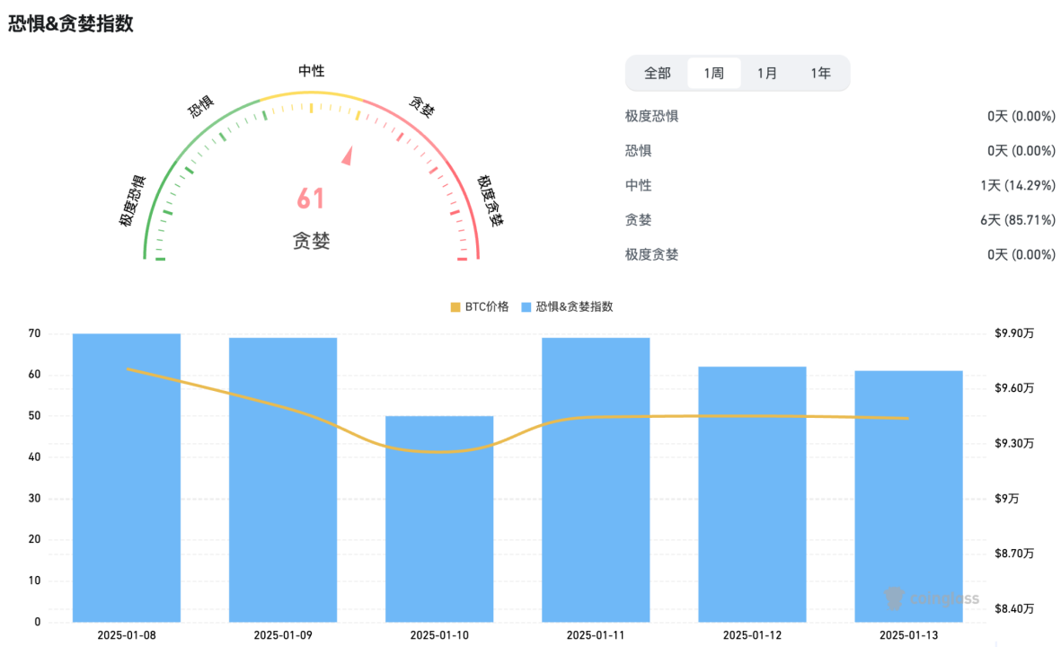 市场情绪变化:加密货币恐惧与贪婪指数下降至61,表明市场情绪从贪婪转为中性。这一变化可能导致投资者采取观望态度,减少买入或增持比特币的意愿,从而对价格产生影响。