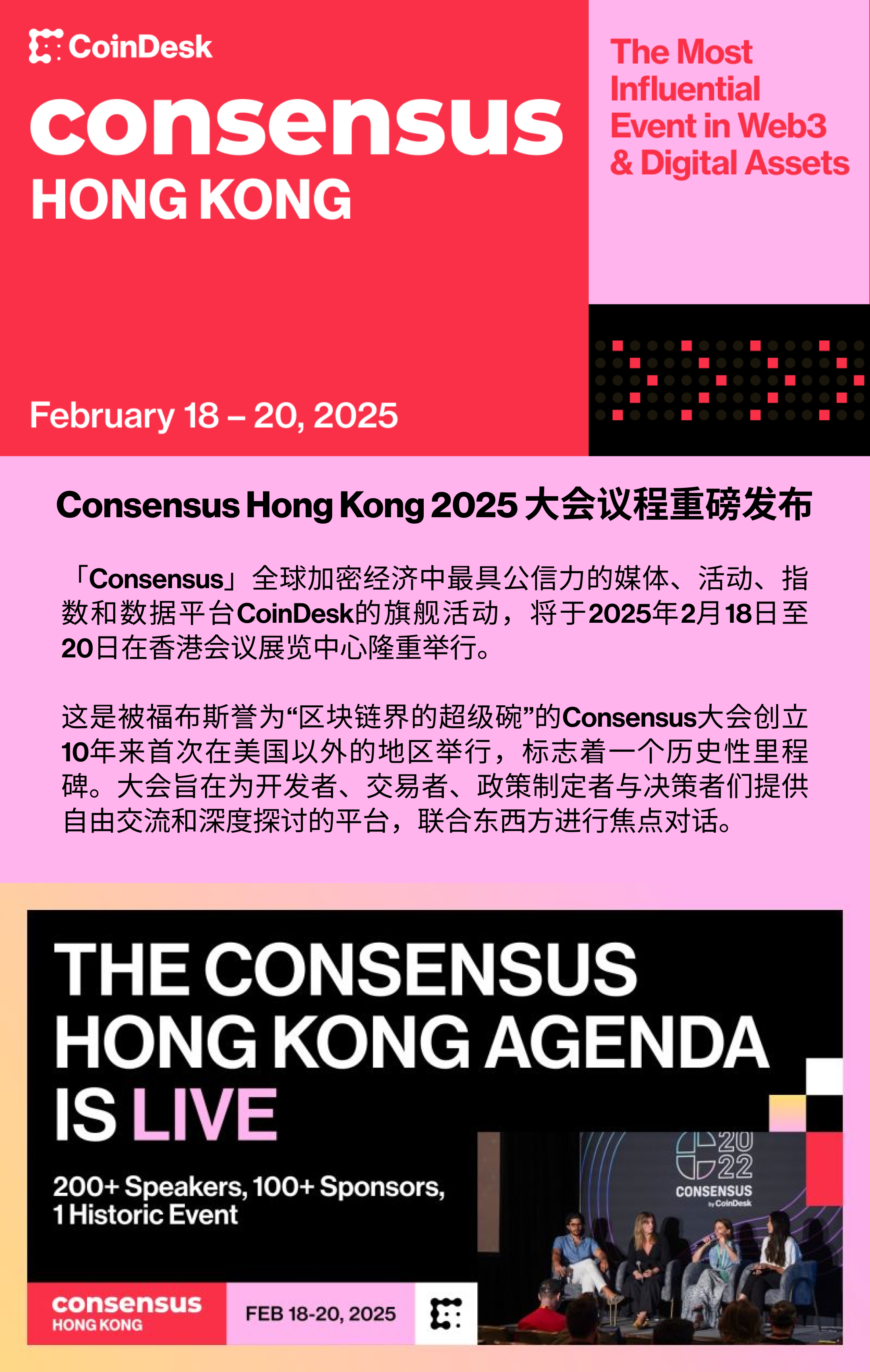 「Consensus」,全球加密经济中最具公信力的媒体、活动、指数和数据平台CoinDesk的旗舰活动,将于2025年2月18日至20日在香港会议展览中心隆重举行。