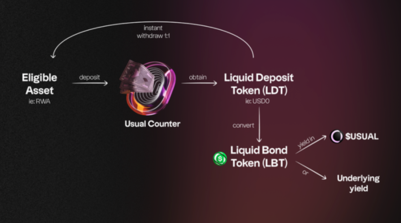 Usual Protocol 推出的稳定币 USD0,通过将美国国债等传统金融资产代币化,提供了两种铸造方式:用户可以通过直接存入 RWA 资产或通过存入 USDC/USDT 间接铸造 USD0,同时还可将 USD0 升级为收益更高的 USD0++,并通过与 DeFi 平台如 Pendle 的合作,为用户提供额外的忠诚度奖励。