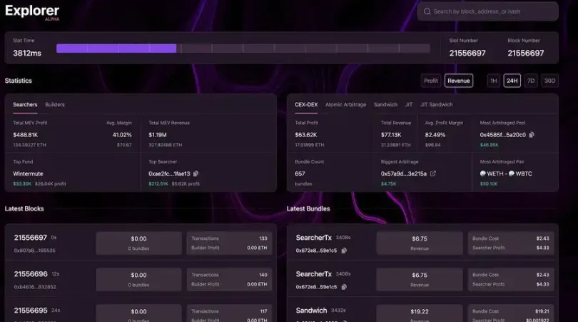1. 区块链浏览器提供 MEV 信息和最新区块的统计数据,包括:搜索者和构建者的统计数据:MEV 收入和利润,顶级基金,顶级搜索者 MEV 事件:CEX-DEX 套利、原子套利、三明治攻击、即时交易