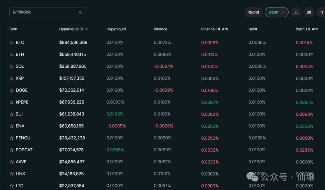 该图为Hyperliquid提供的资金费率面板,其本意是给用户提供一个直观的资金费率对比,方便用户进行跨市场套利,但却暴露了Hyperliquid一些耐人寻味的问题。我们可以看到,大部分Token的资金费率都是雷同的,保持在默认的0.01%,许多人依此怀疑其实Hyperliquid上根本没有那么多实际交易量。