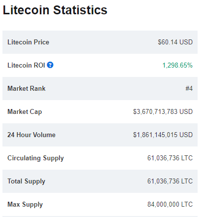 LTC目前基本情况LTC总供给量8400万个,目前已经挖出6100多万个,现价60美金一个,总市值36.7亿美金,排名第四。