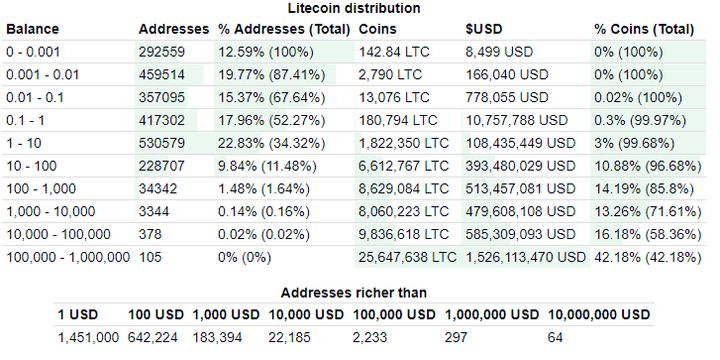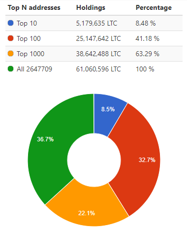 前10、100、1000地址持币占比LTC的分配情况显示出目前加密货币领域的通病,大量的筹码集中在少数头部的地址当中,前500位地址占据LTC近60%的量,但相较于其他小币种,LTC地址的分配情况已经较为分散,跟大部分主流币的情况差不多,并且这其中包涵了中心化交易所的地址。
