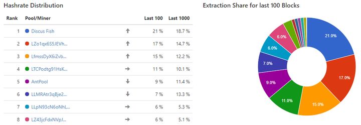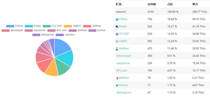 LTC矿池份额LTC矿池份额占比基本都比较均有,最高的F2Pool占比20.45%,前几大矿池的占比都比较接近,这有利于维护币种的安全和矿工的利益,而全网总共269.77 TH/s的算力,相较于BTC 47.31 EH/s和BCH 1.6EH/s还是有一定的差距。