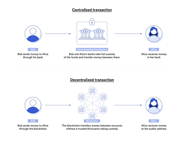 - 点对点:区块链没有中间方榨取交易价值,各方可以直接展𫔭交易,无须担心任何对手方风险(注:对手方风险指合约对手方不履约的风险)。总的来说,区块链为交易各方创造了一个安全、可靠且防篡改的经济交易基础架构。传统交易模式依靠可信协力厂商来控制对手方风险,而区块链则依靠高确定性的𫔭源软体严格执行指令来控制风险。区块链帮企业免除了对𧹔负担、取消了不必要的中间方并降低了对手方风险,因此极大提升了企业效率。