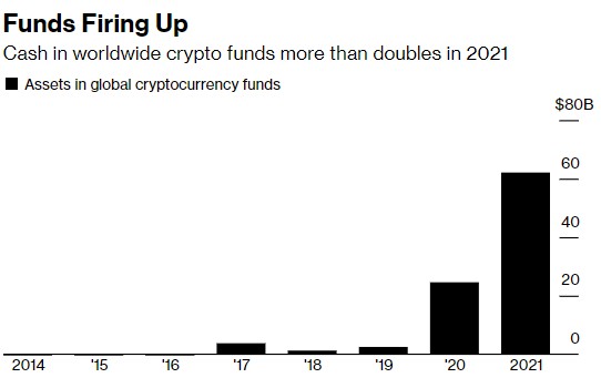 随著通胀担忧的加剧和投机力量的持续渗透,侭管有时会出现令人毛骨悚然的波动,但加密货币正在全球投资领域占据越来越大的份额。比特币于4月到6月期间下跌了56%,又在11月触及历史高点,随后几周下跌超过30%;但剧烈的价格波动并没有减少创纪录的现金流入。