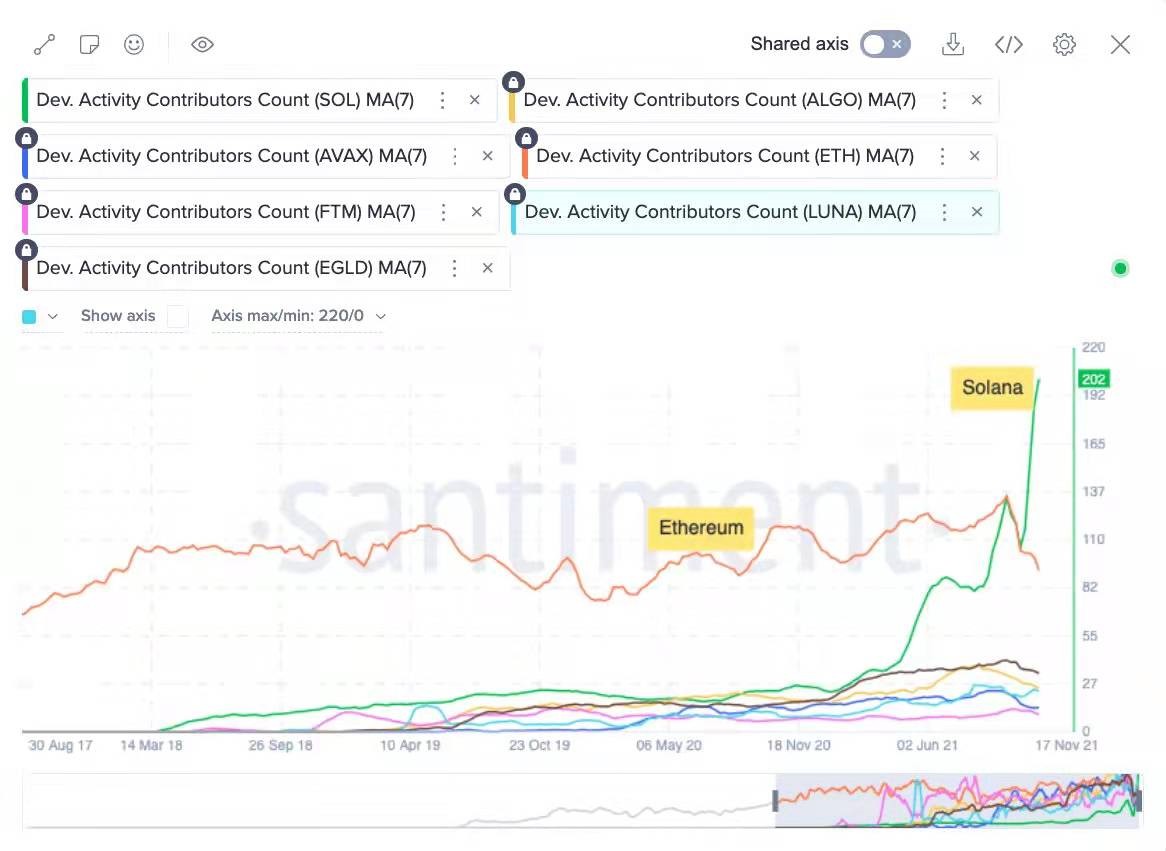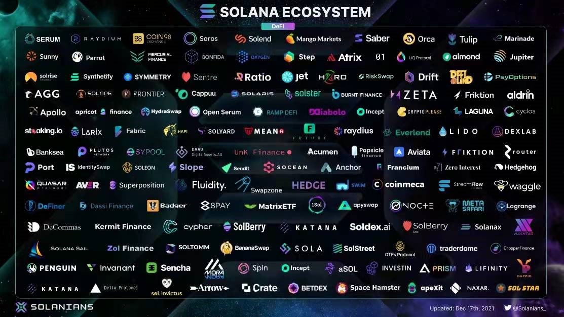 ——Solana总市值达到以太坊的50%。SBF相信,Solana开发DeFi协议的独特基础技术也将推动其SOL代币价格的飙升,甚至他认为,Solana可能会超越以太坊成为最大的去中心化金融平台。虽然目前Solana市值(约550亿美元)距离以太坊(约4700亿美元)还有将近8倍的差距,但如果到达50%的以太坊市值,一定会是Solana发展过程的重要里程碑。