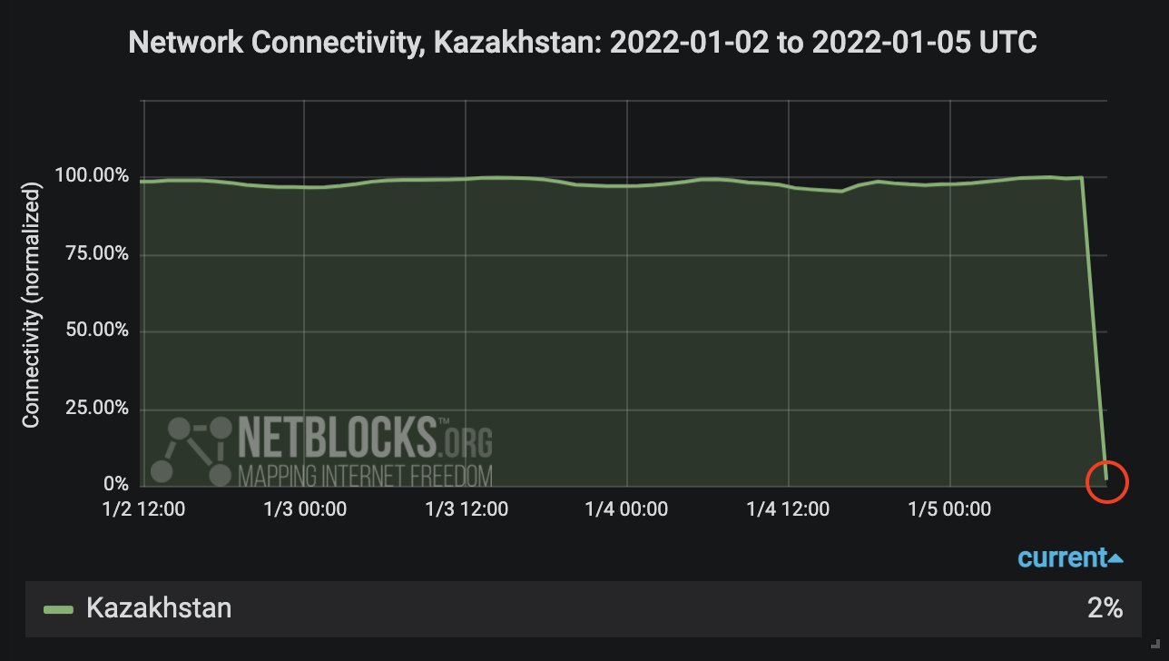 拥有世界上第二大(BTC)挖矿算力的哈萨克斯坦,在当地反政府抗议活动中,正经历着重大的互联网中断。