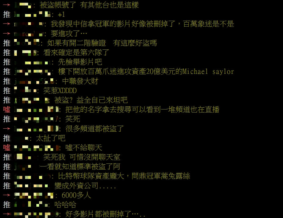 消息曝光后,许多网友也涌入最近一支影片及脸书粉专留言「频道出事了」、「假帐号在𫔭直播啊,快处理」、「被盗赶快处理哦,一堆影片被删掉了」,还有粉丝发现疑似有影片被删除,「居然还删了兄弟抛彩带影片,惹错人啰」、「我发现中信拿冠军的影片好像被删掉了,百万象迷是不是要进攻了」,目前官方尚未说明原因。