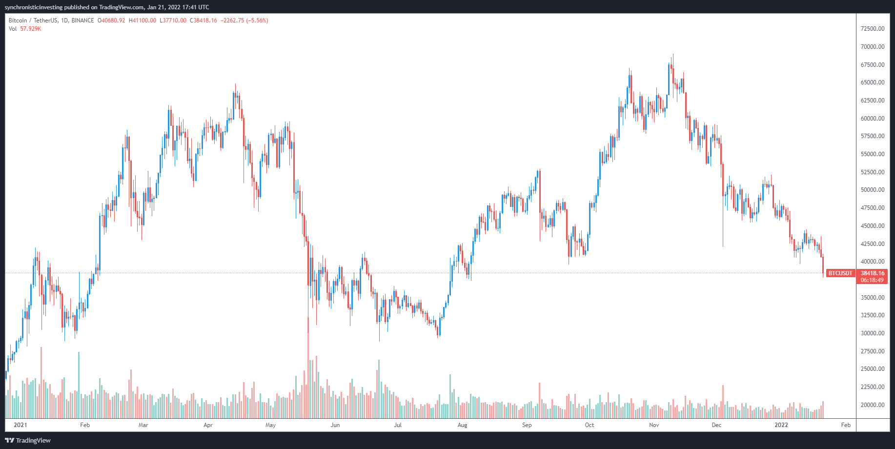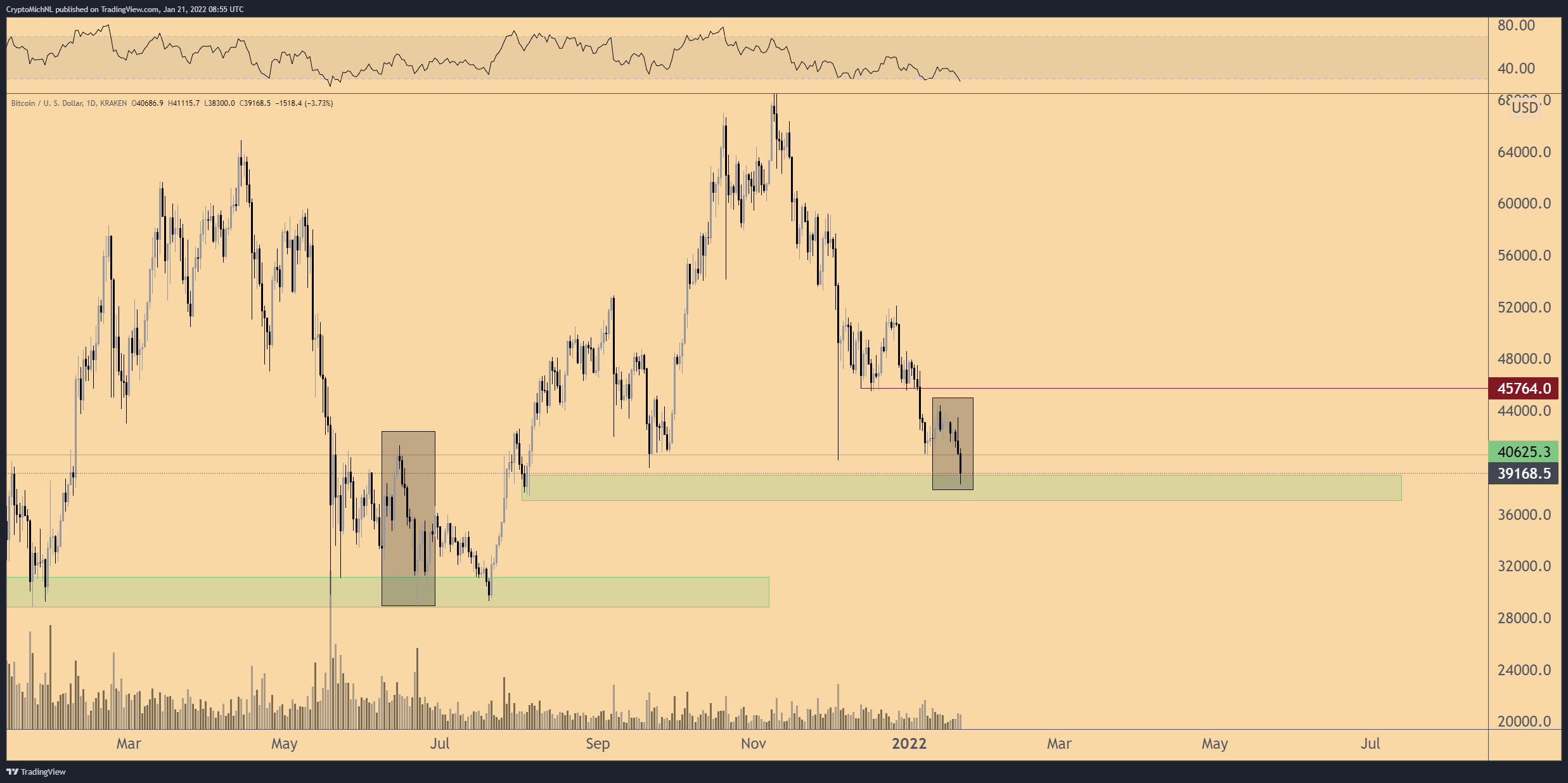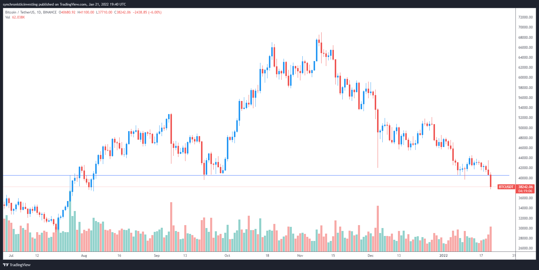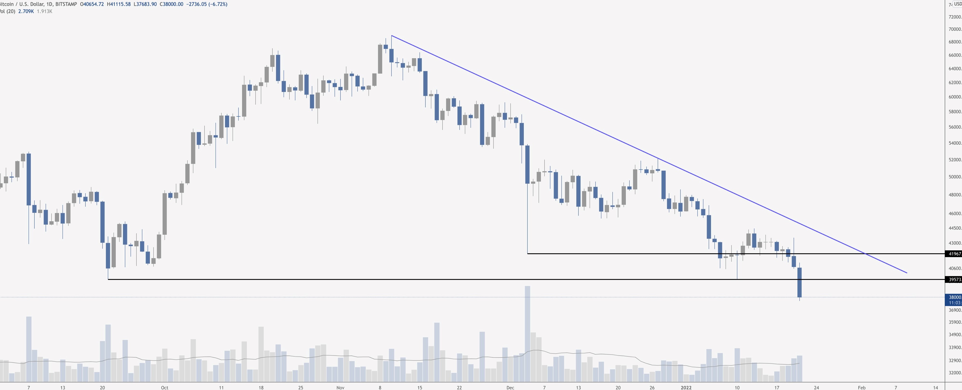 Cointelegraph Markets Pro和TradingView的数据显示,始于1月20日晚些时候的一波抛售浪潮一直持续到周五中午,当时BTC触及3.66万美元的低点。