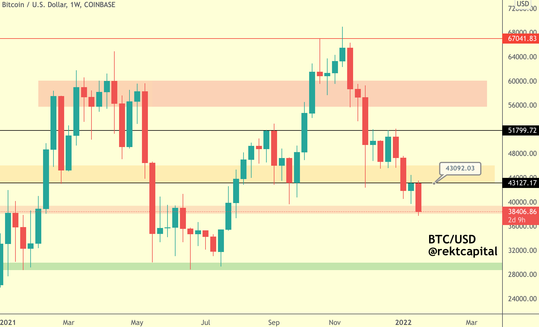 如下图所示,Rekt Capital发布的,“最近的BTC下跌意味着BTC现在处于其当前38000-43100美元区间的较低区域。”