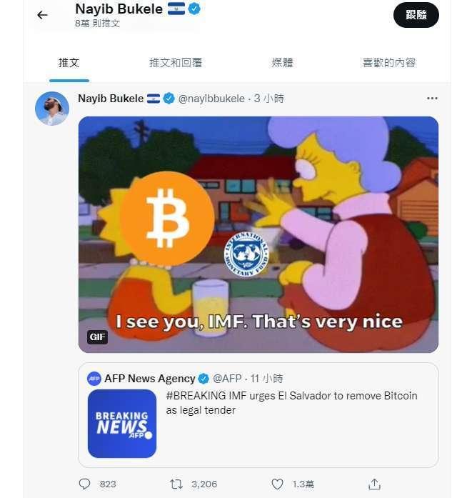 戮力推动「全民比特币」的萨尔瓦多总统 Nayib Bukele 在推特上回应 IMF 的呼吁,可见图片写「知道了,很好。」