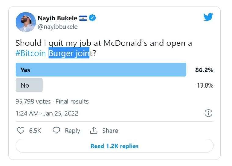 面对比特币价格低迷,反对比特币者戏称「比特币暴跌后,大家都去当麦当劳员工 (因时薪仅 11 美元)」,萨尔瓦多总统 Nayib Bukele 周一在推特上以问卷调查反击,称「我该辞去麦当劳的工作,改𫔭一家设有比特币 ATM 的 Burger joint 吗?」