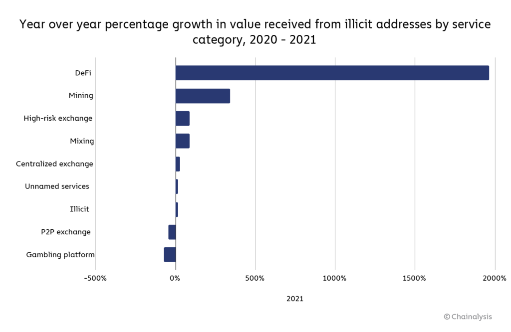 Chainalysis表示:“矿池、高风险交易所和混合平台也从非法地址获得了大量的价值增长。”