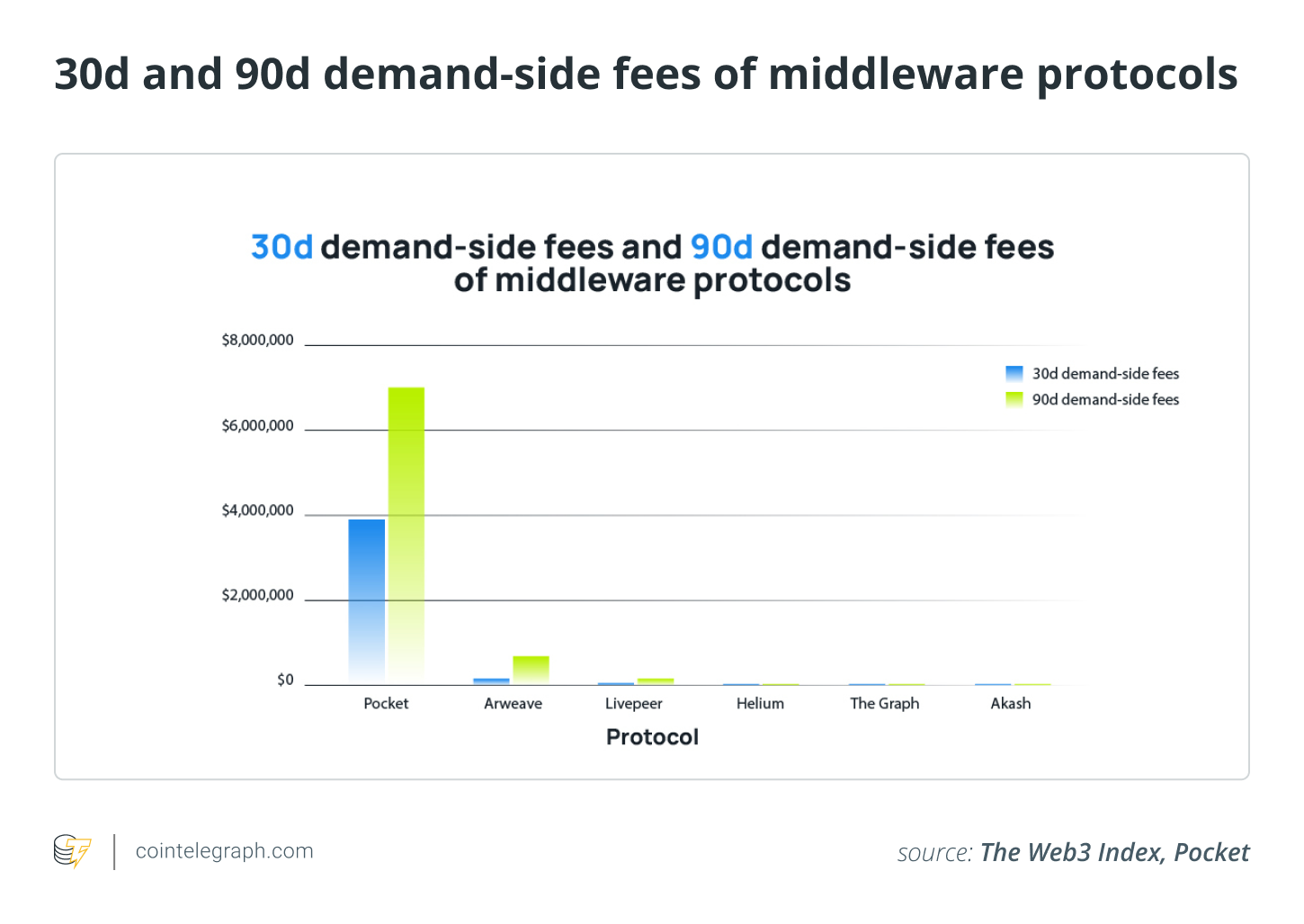 Web3 Index跟踪去中心化开发者栈各层服务协议的需求方费用(DSF)。例如,Pocket在30天内产生390万美元的DSF,因为它采用了一种新颖的通缩支付模式。这意味着开发人员通过稀释支付费用,节点则通过通胀获得收益。