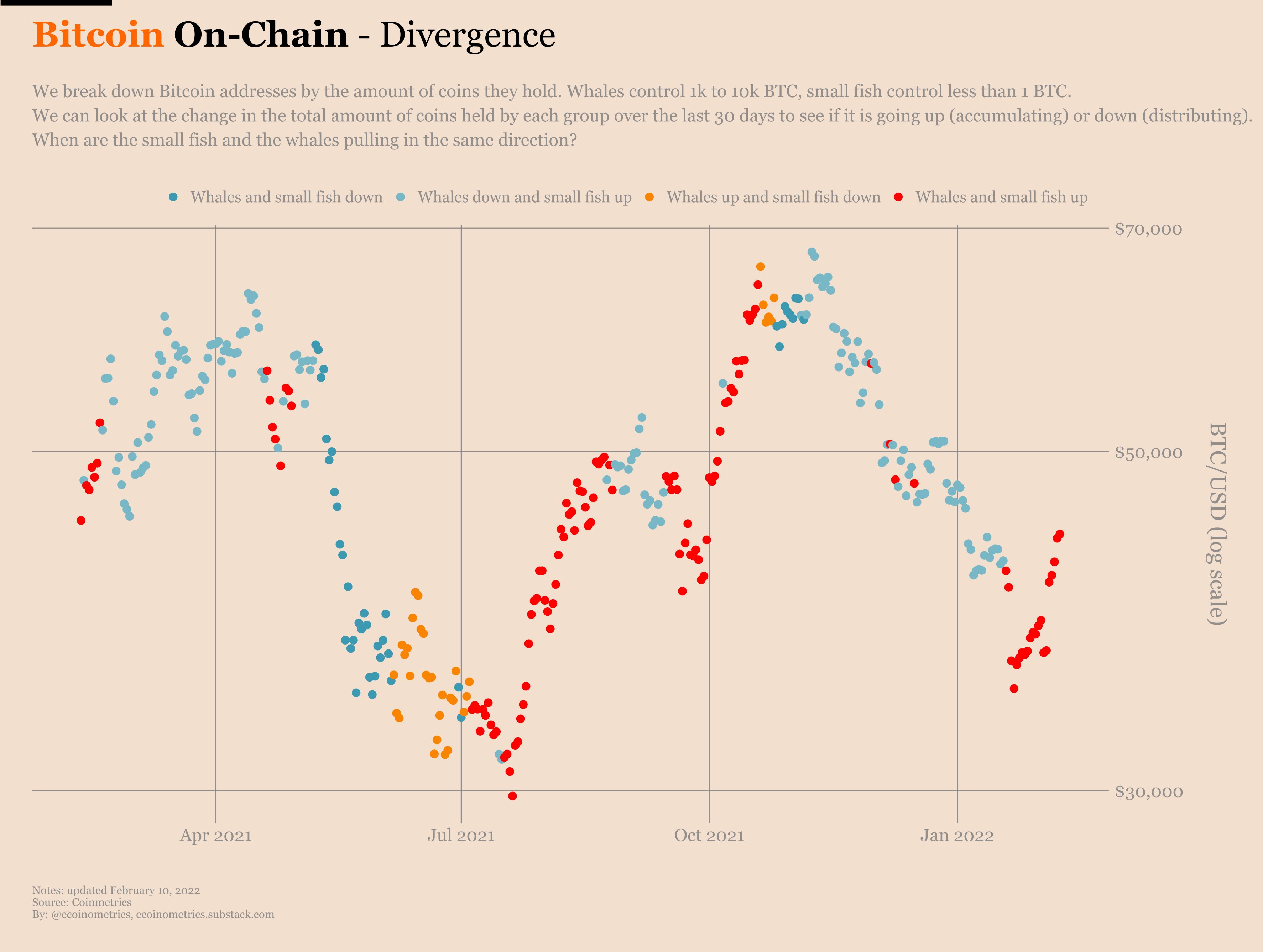 Ecoinometrics 分析师Nick在美联储7号发布的一份报告中写道:“在这个周期中,价格的反弹与鱼和鲸鱼在较长一段时间内同时买入密切相关,”他补充道: