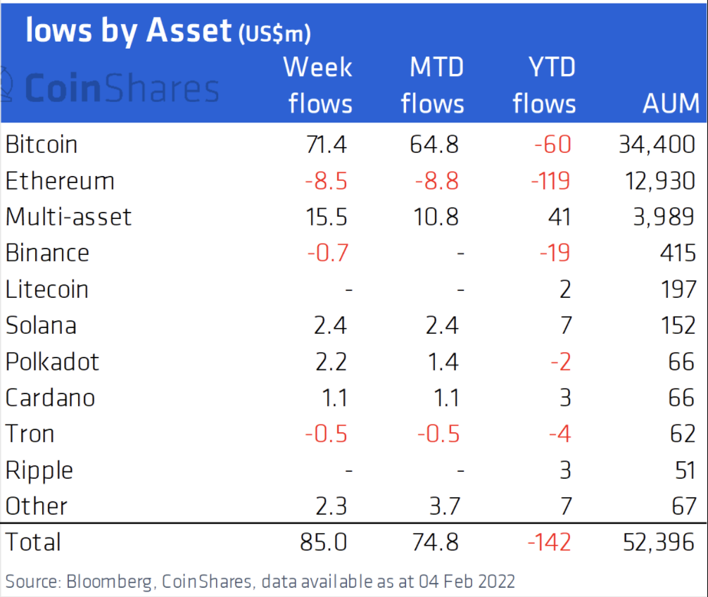 截至 2022 年 2 月 4 日,净流入数字资产 来源:CoinShares,彭博社