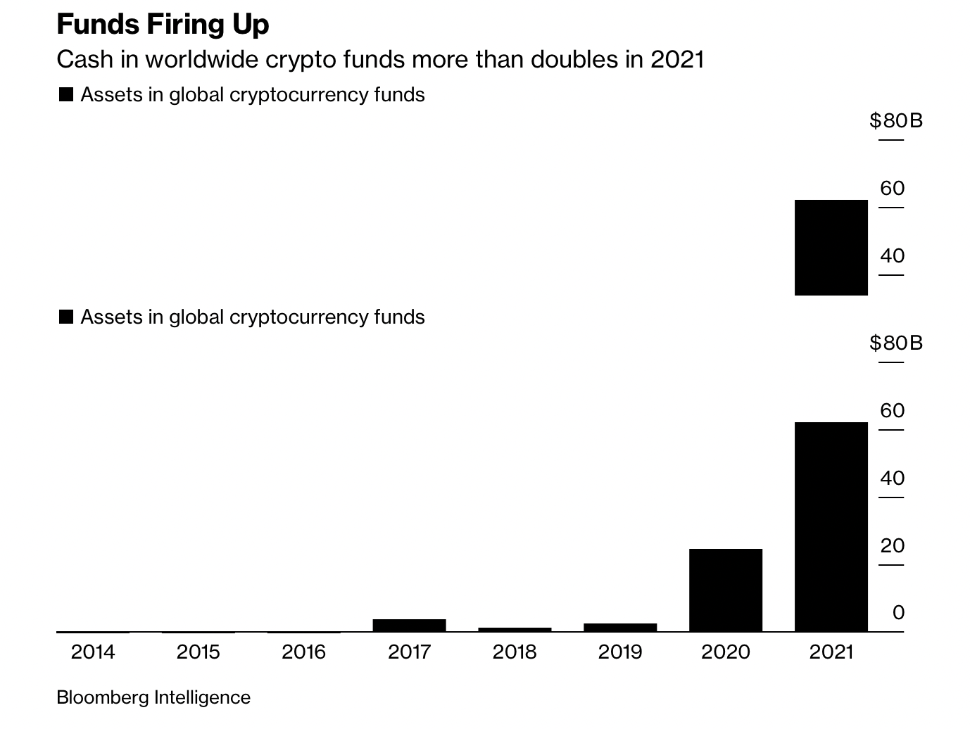 流入加密货币基金的现金在2021年翻了一番 来源:Bloomberg Intelligence