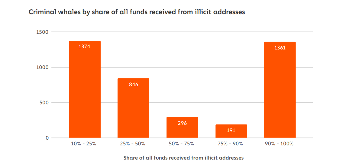 该报告将犯罪鲸鱼定义为拥有价值超过100万美元加密货币的私人钱包,其中余额的10%以上来自非法地址。