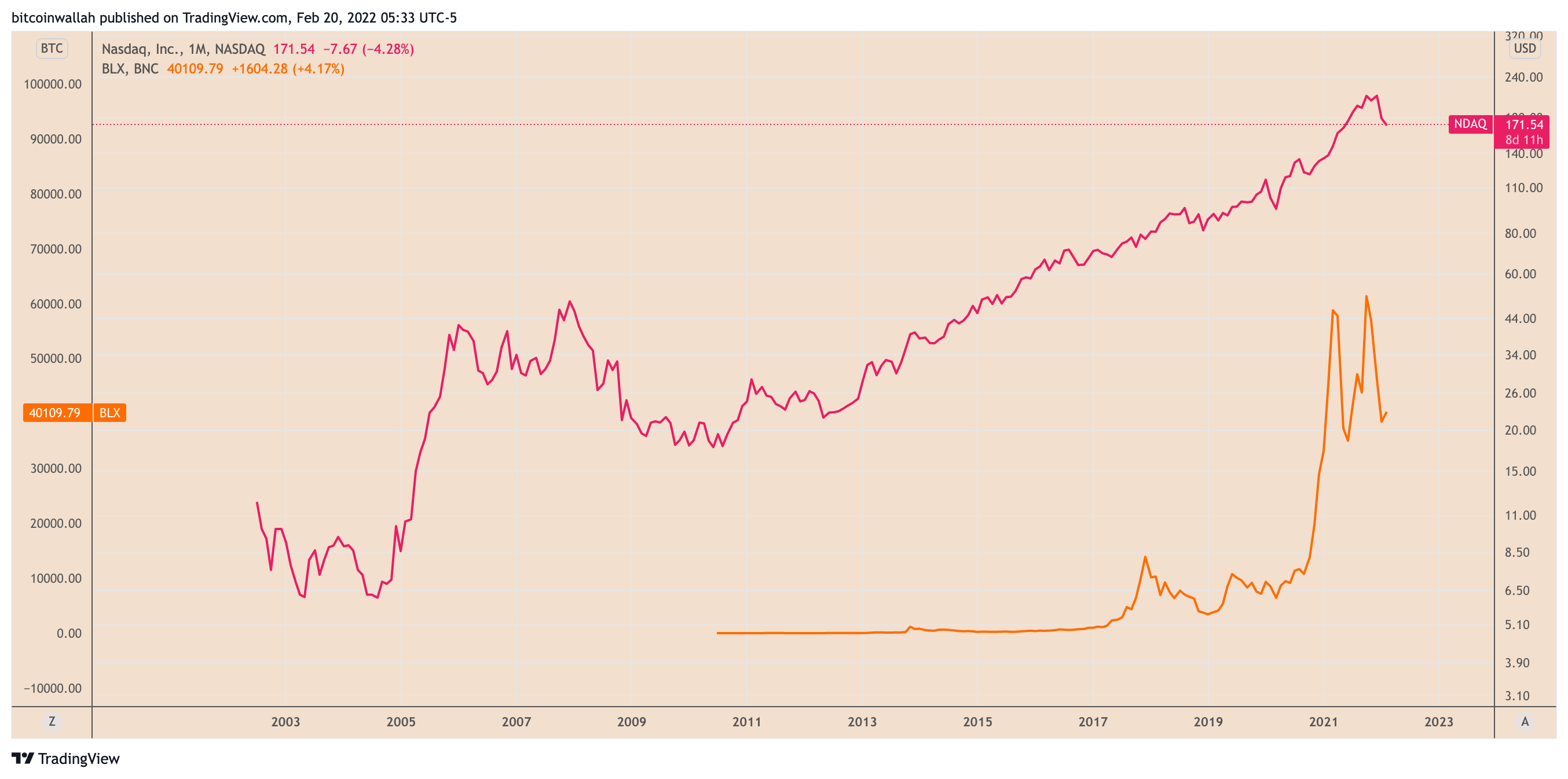 BTC/USD 与纳斯达克综合月价格图表 来源:TradingView