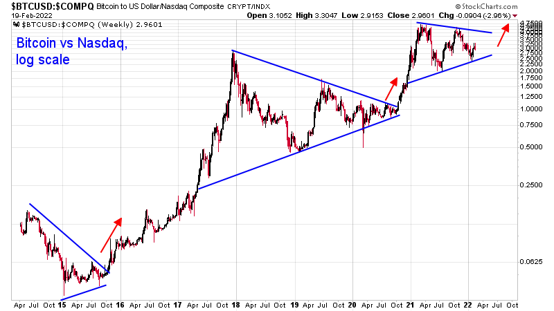 BTC/USD 与纳斯达克综合价格周线图 来源:Tuur Demeester,StockCharts.com