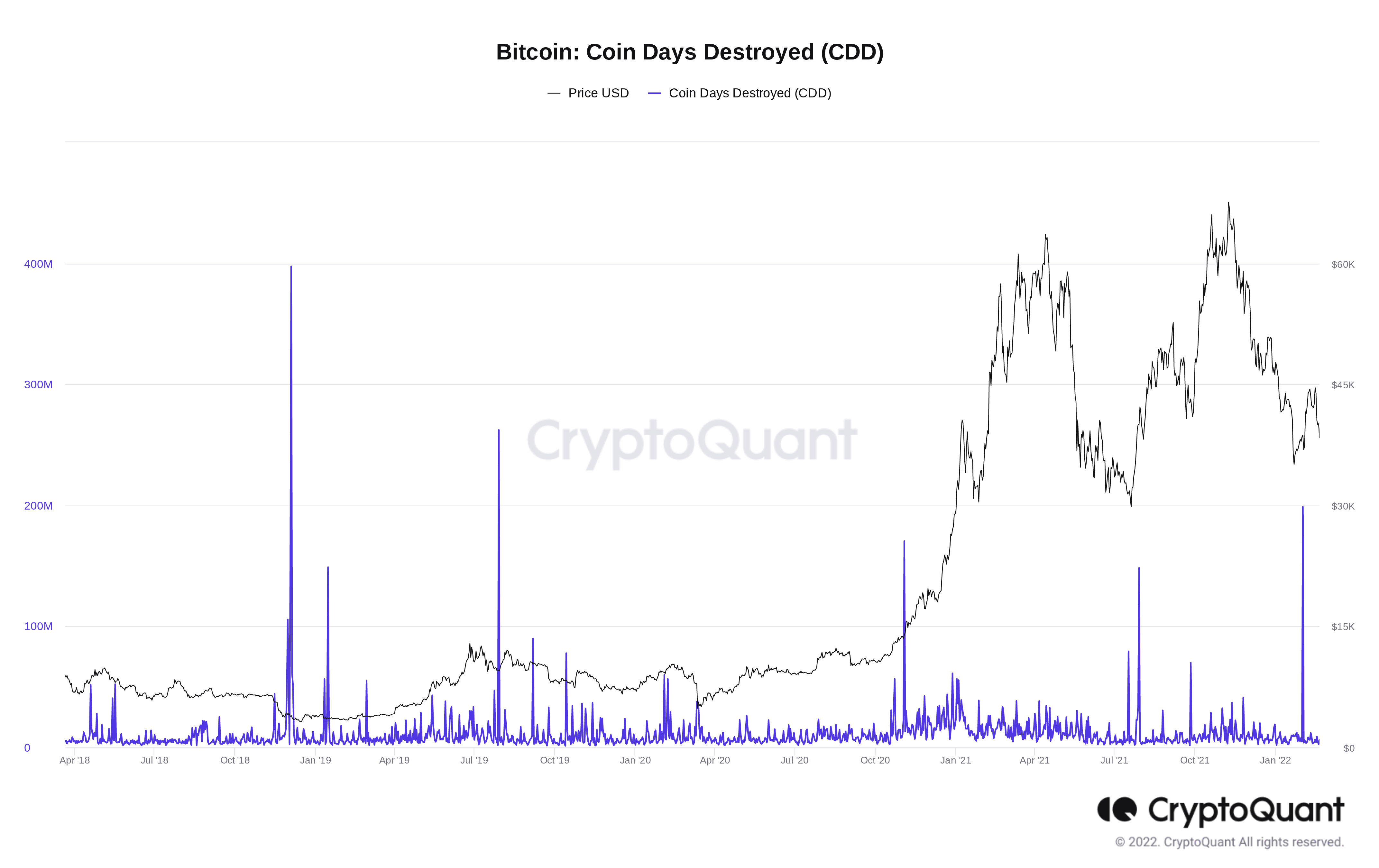 这次的数据集来自CryptoQuant,其管理“被摧毁的比特币休眠天数”(CDD)——自每一个BTC在特定的一天最后一次移动以来的累计天数。