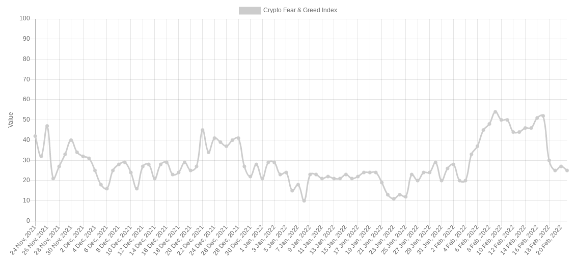 试图量化市场情绪的流行情绪指标“加密货币恐惧与贪婪指数”也表现出对这一点的赞同。
