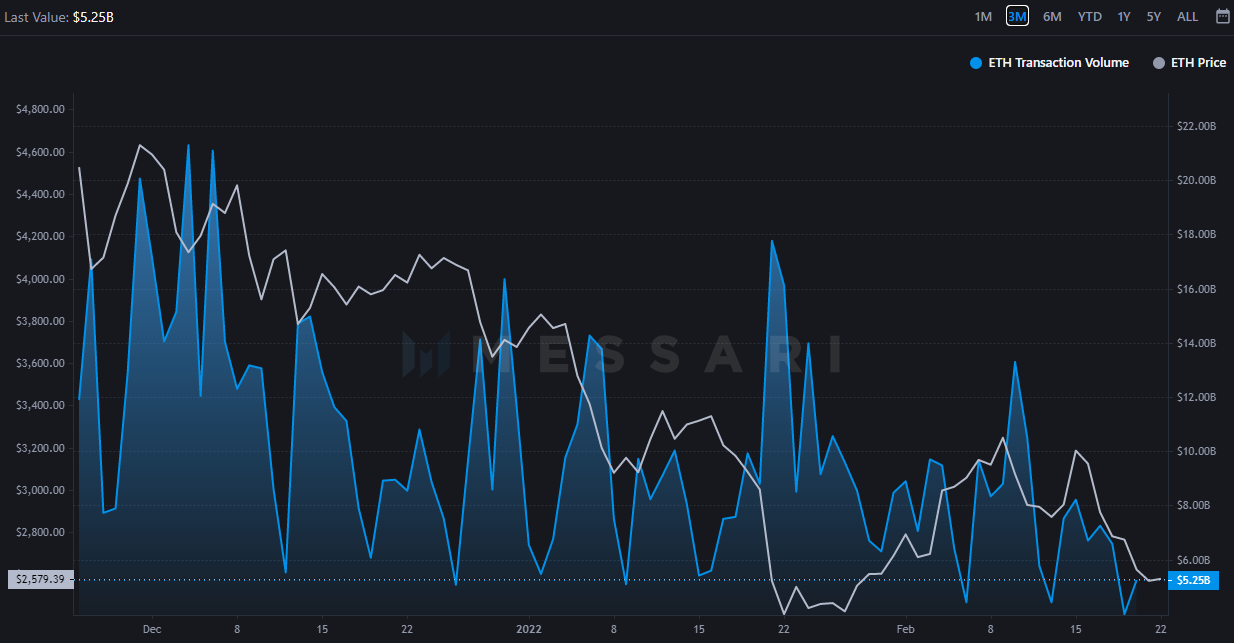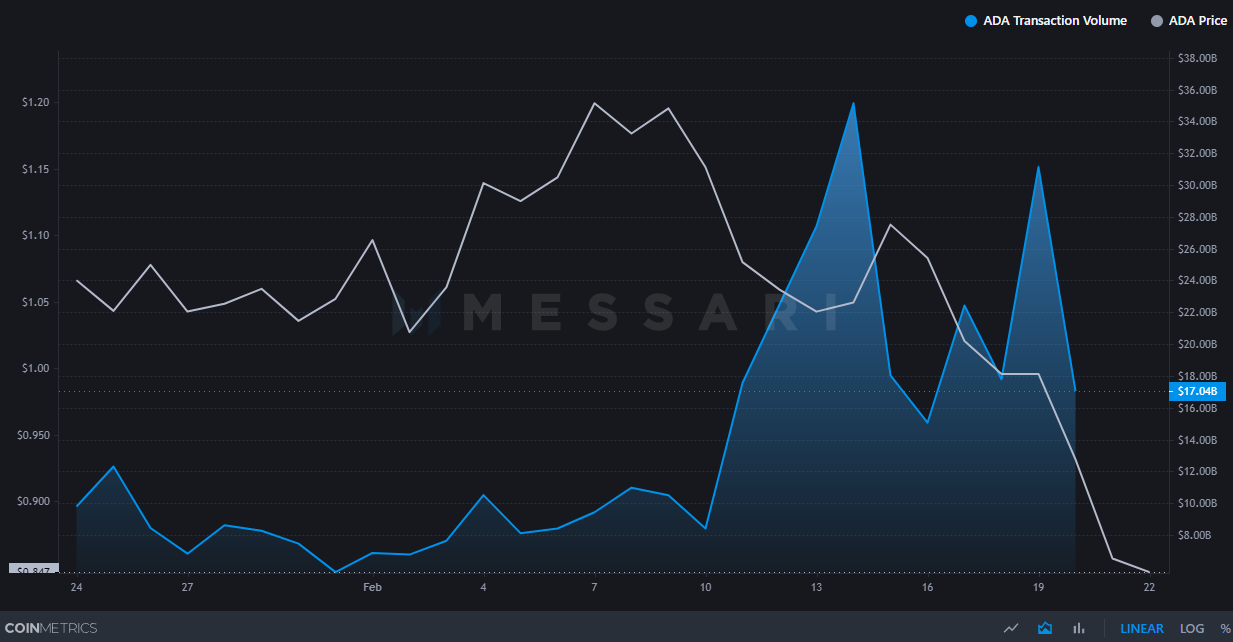 随着比特币和以太坊最近的网络活动在减少,Cardano晋升的条件已经成熟。比特币24小时交易量较11月25日的三个月峰值1160亿美元下降了84%。以太坊交易量自12月4日达到212.9亿美元的三个月峰值以来一直在下降,在2月19日下降82%,达到3个月以来的最低水平39.9亿美元。