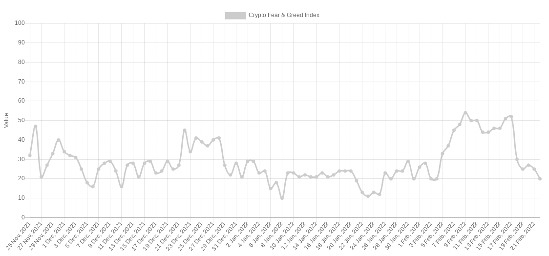 人们的情绪也受到了最近事件的打击,加密货币的恐惧和贪婪指数下降到20/100,远远处于“极端恐惧”的范围内。