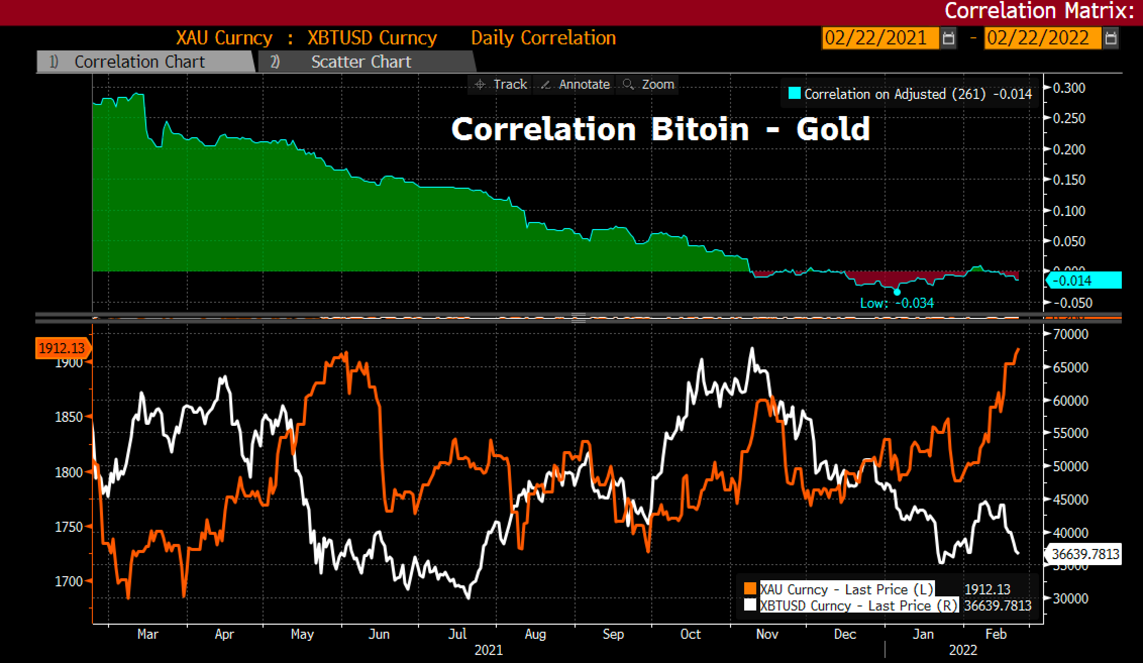 “数字黄金(比特币)已经暴跌到37000美元以下,而黄金已经上涨至1900美元/盎司以上。数字黄金和黄金类似物之间的相关性现在甚至是负的。关于数字黄金是更好的逃生方式的说法在乌克兰并未得到证实。”