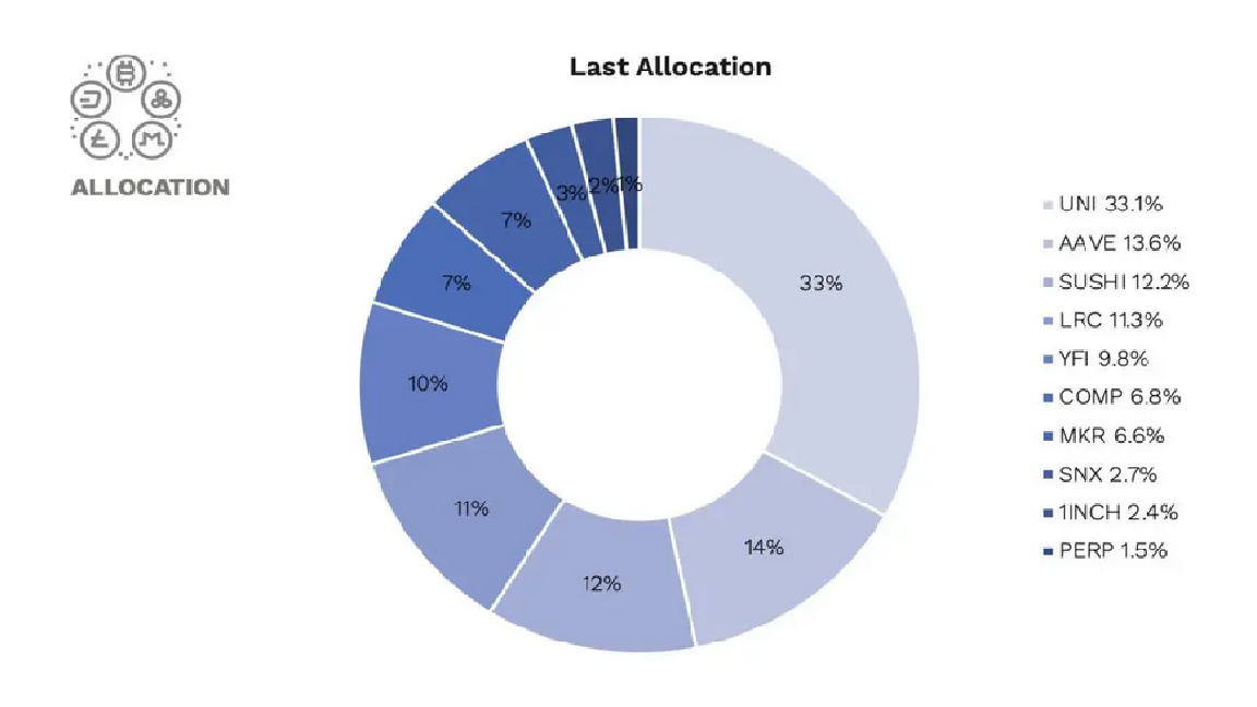 任何给定代币的最大权重上限为 35%,并且每个月都会选择资产组。该公司每月列出 20 多种可用作指数成分的经批准代币,例如 UniSwap (UNI) 、Compound (COMP) 、Aave (AAVE) 和 SushiSwap (SUSHI)。